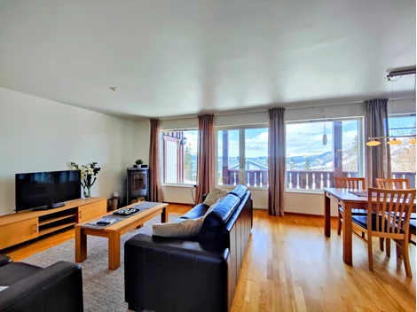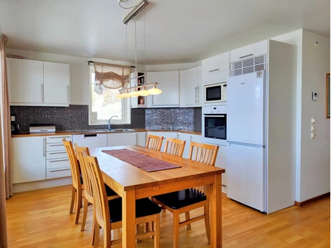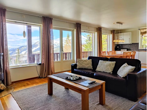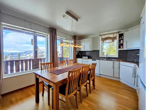 Allrum och kök ligger i öppen planlösning där soffhörnan med TV och matplats/kök delar utrymmet. Utgång till altan i soligt sydvästläge med utsikt över Åresjön och Åreskutan. Köket har vita luckor, arbetsbänk i laminat och mosaik samt fullständig maskinell utrustning: kyl/frys, ugn, mikrovågsugn, spishäll, köksfläkt och diskmaskin. Skidförråd finns på altanen.