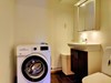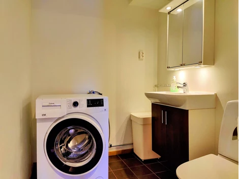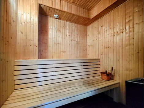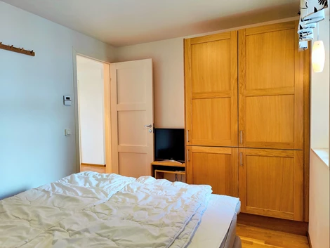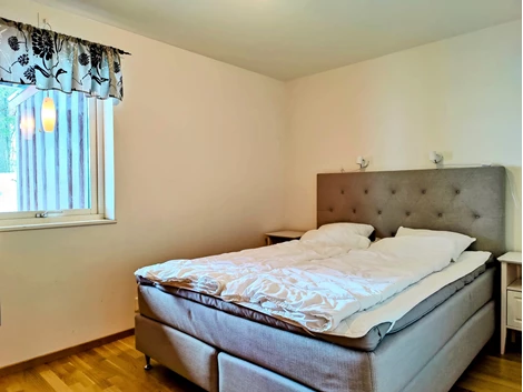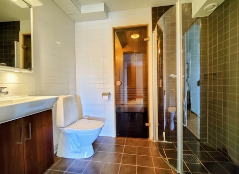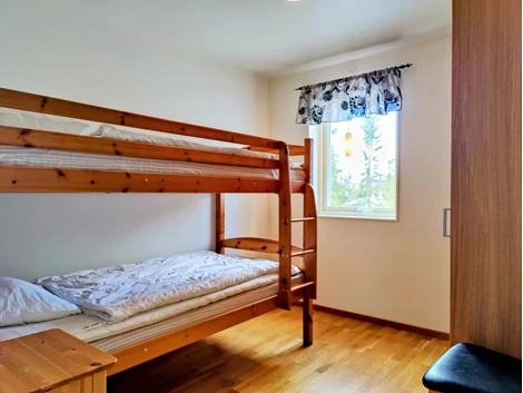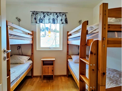 De tre sovrummen är väl planerade: ett mindre sovrum med två våningssängar och två garderober, ett sovrum med dubbelsäng, TV och två garderober, samt ett mindre sovrum med våningssäng och två garderober. Duschrum med klinkergolv och kaklade väggar innehåller duschhörna, handfat med kommod, spegelskåp och bastu. Extra toalett finns med WC, handfat och tvättmaskin.