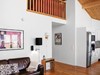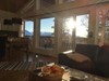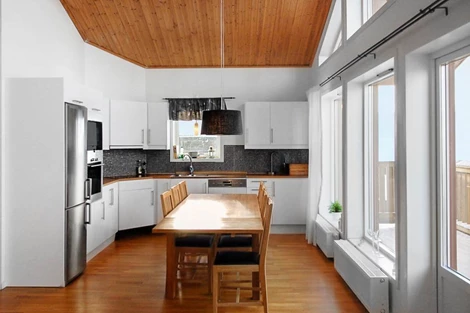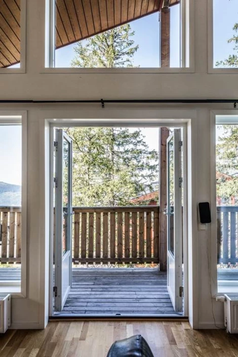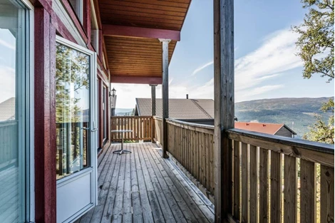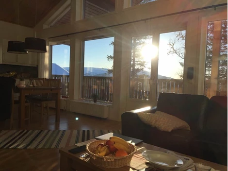 Storstuga/kök: Högt till tak - nära 6 m till nocken. Stort fönsterparti mot Åresjön/Skutan och utgång till balkong. Täljstenskamin.