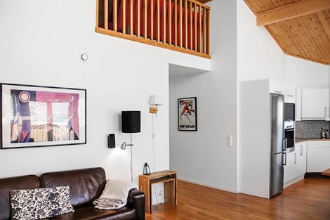 Lägenheten är belägen en trappa upp och disponeras i två plan med fyra sovrum samt två generösa allrum. På övre plan möts ni av ett ljust sällskapsrum med fin utsikt över fjällvärlden, medan allrummet på entréplan bjuder in till avkoppling framför kaminen. Köket har en luftig känsla med högt i tak och stora fönsterpartier, och är fullt utrustat för bekväma vistelser. Här finns även en rymlig matplats där alla får plats.