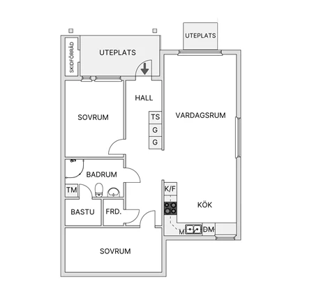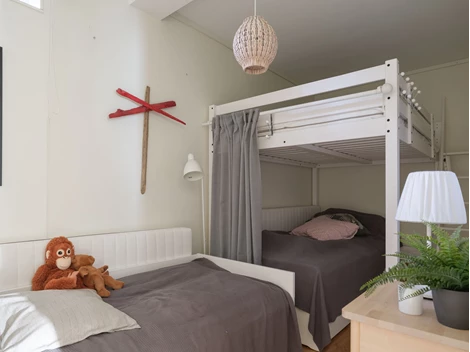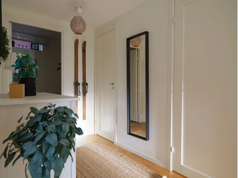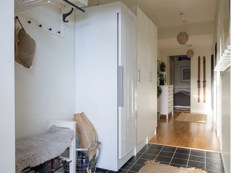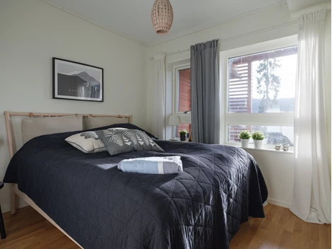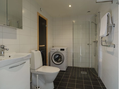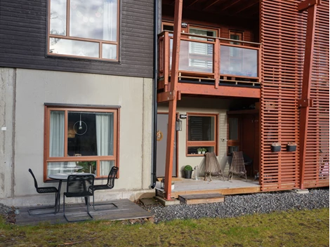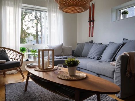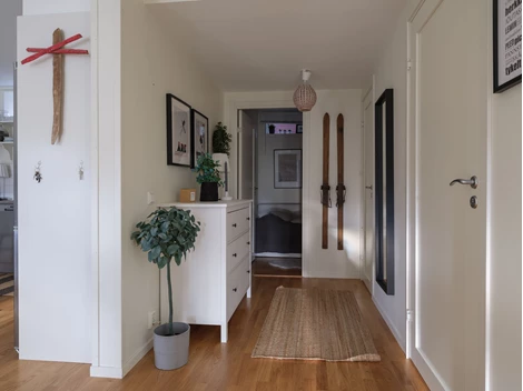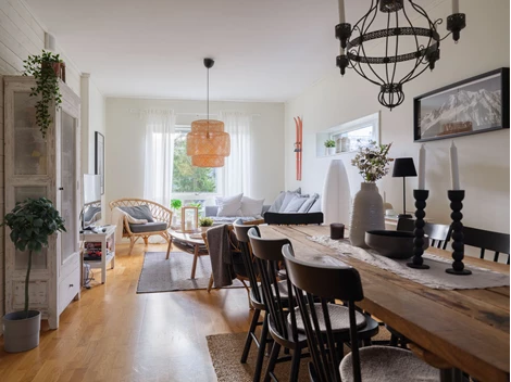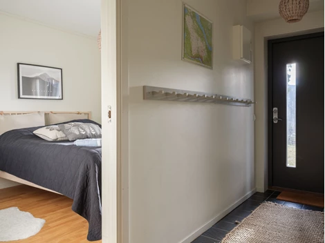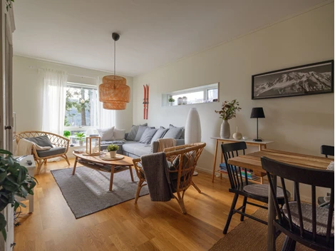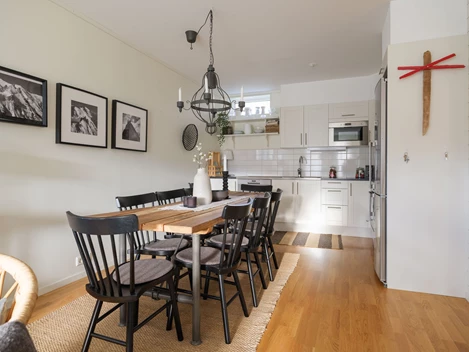 Bostaden har en modern och öppen planlösning mellan kök och allrum – en naturlig samlingsplats för familj och vänner. Här finns två sovrum, ett fräscht badrum med bastu samt ett praktiskt förråd i hallen och golvvärme i hela lägenheten. Utanför entrén finns ett skidförråd och det finns även ett uppvärmt lägenhetsförråd i separat byggnad.