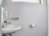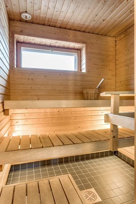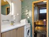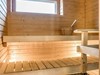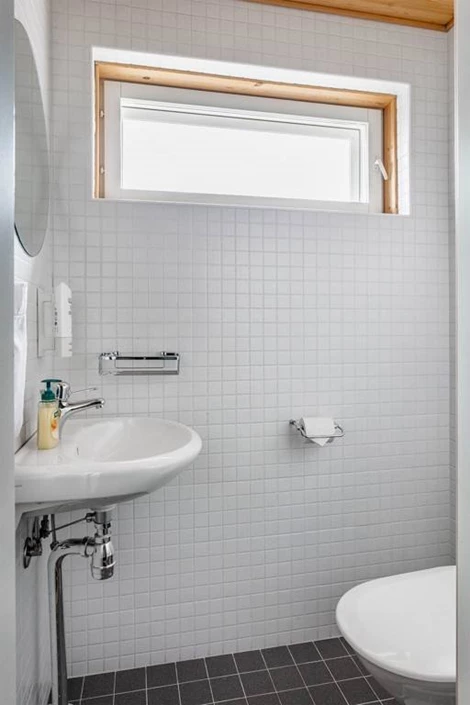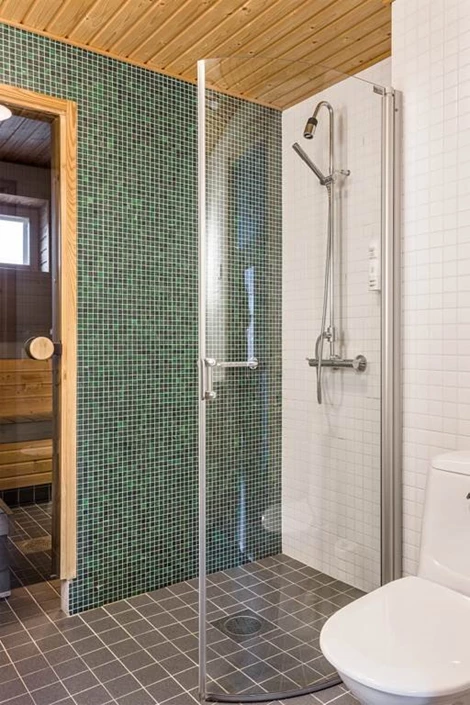 Duschrum med bastu och tvättmaskin. Gästtoalett.