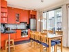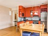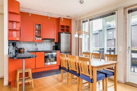 Allrum och kök i öppen planlösning. Kök med mikrovågsugn, diskmaskin, spis och fläkt.