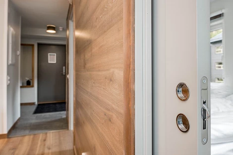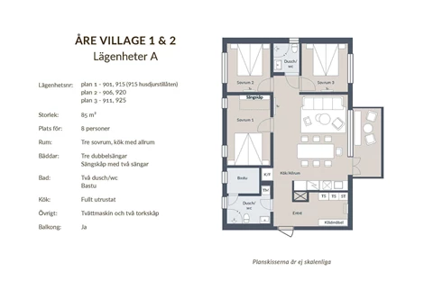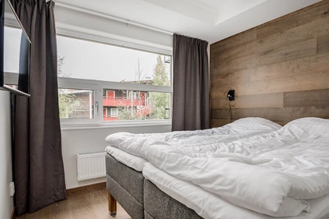Lägenhet 901 är 85 m² och erbjuder en stilren, funktionell planlösning med två sovrum där båda sovrummen har ett smart sängskåp som skapar två extra sovplatser när det behövs, utan att ta plats när de inte används. I samtliga sovrum finns sköna YouBed-sängar där du själv kan justera fastheten för optimal komfort. Lägenheten har två badrum, varav ett med ett med tvättmaskin och egen bastu som bjuder in till avkoppling efter en dag på fjället. Det rymliga vardagsrummet har utgång till en balkong i söderläge med utsikt över Åresjön. Totalt finns 6+2 bäddar.